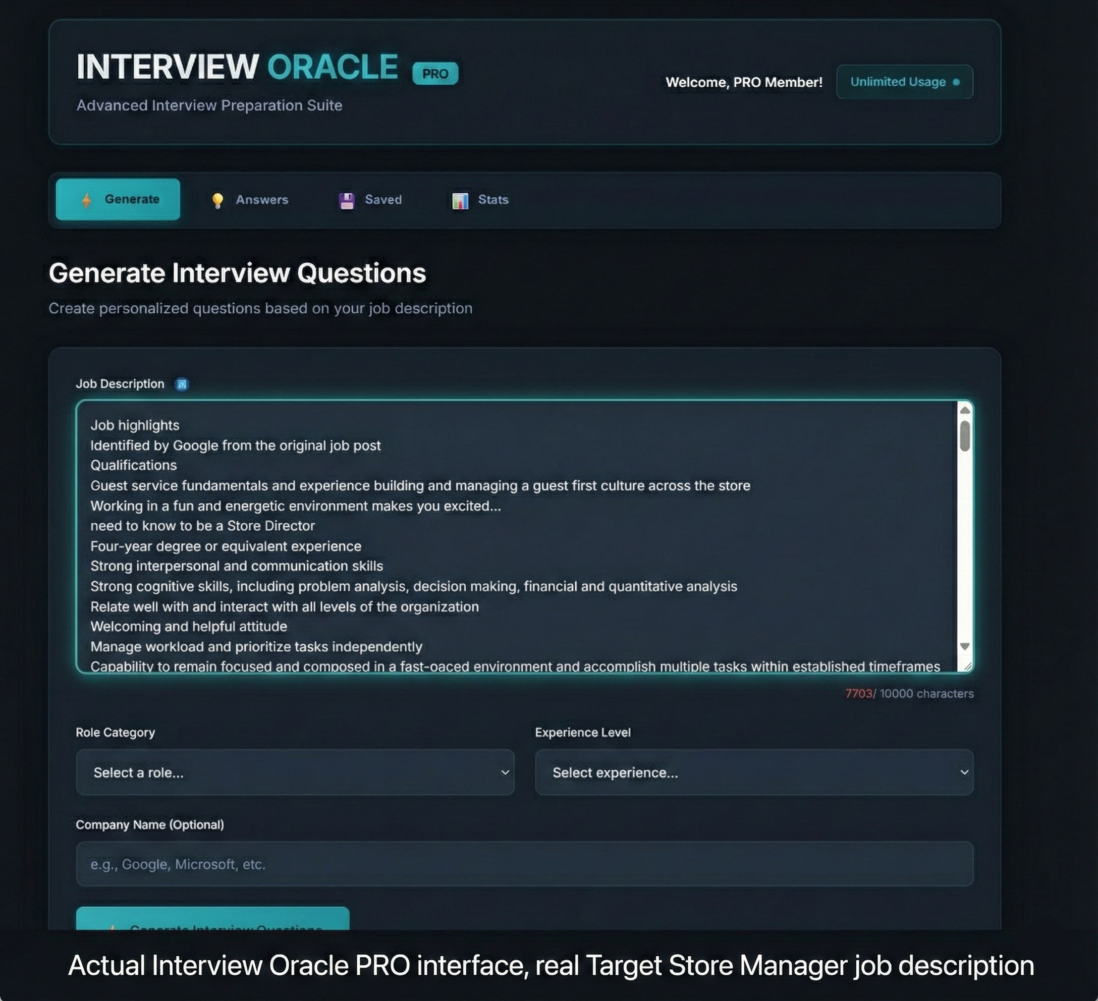 Interview Oracle PRO analyzes your job description and predicts the specific questions your interviewer is preparing right now, then generates complete tailored answers for every one of them