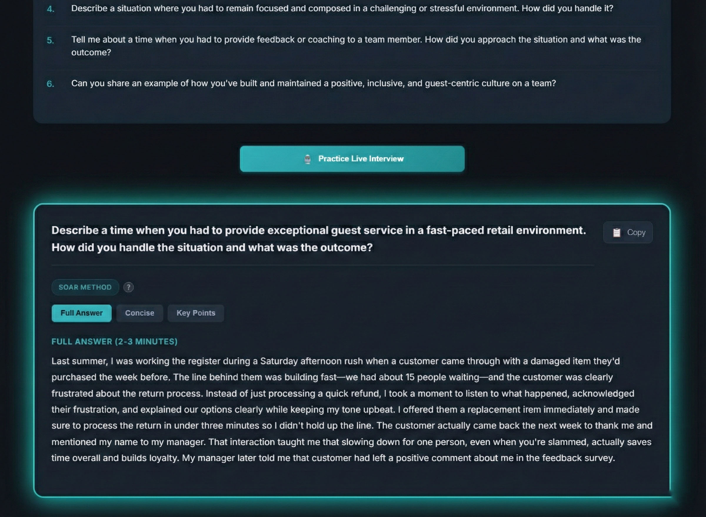 Behavioral questions get storytelling structure. Technical questions get clear confident responses. You're not starting from scratch. You're refining answers that already fit.