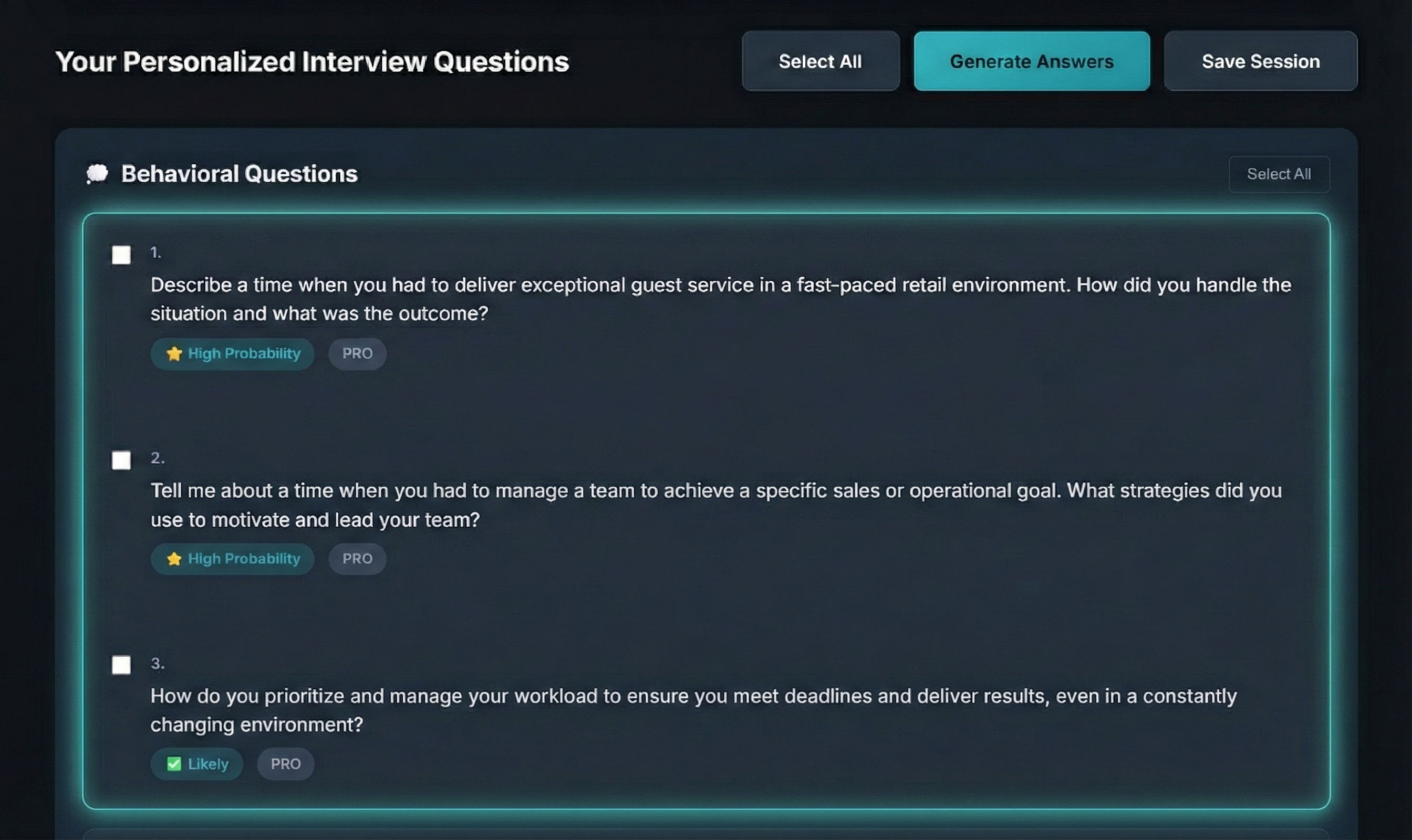 Behavioral, situational, and company/role-specific, all tailored to the exact job you're interviewing for.